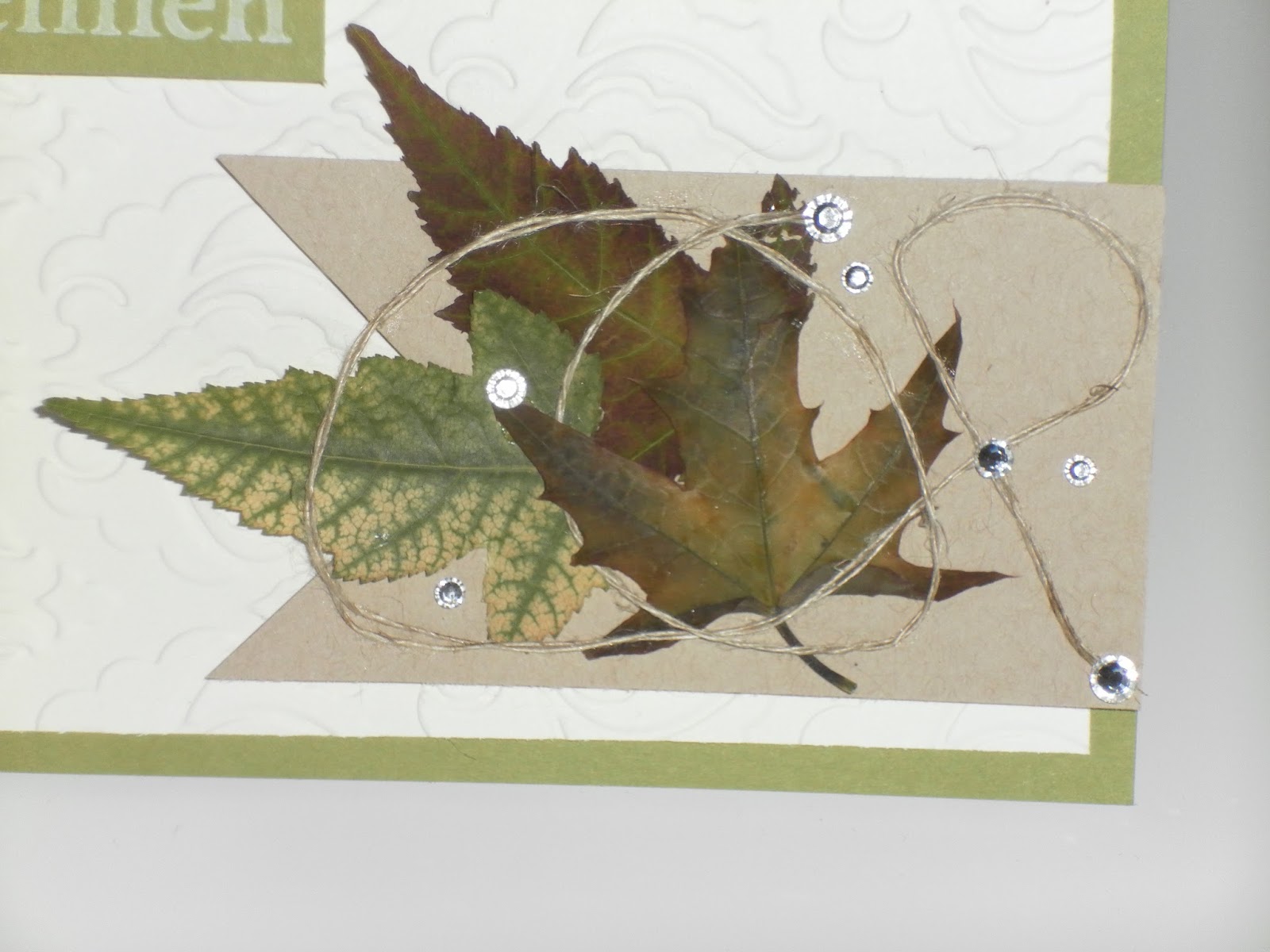 Bevor der Schnee schon bald die herbstlich gefärbten Blätter bedeckt, habe ich noch ein paar von ihnen für eine herbstliche Grußkarte verwendet.